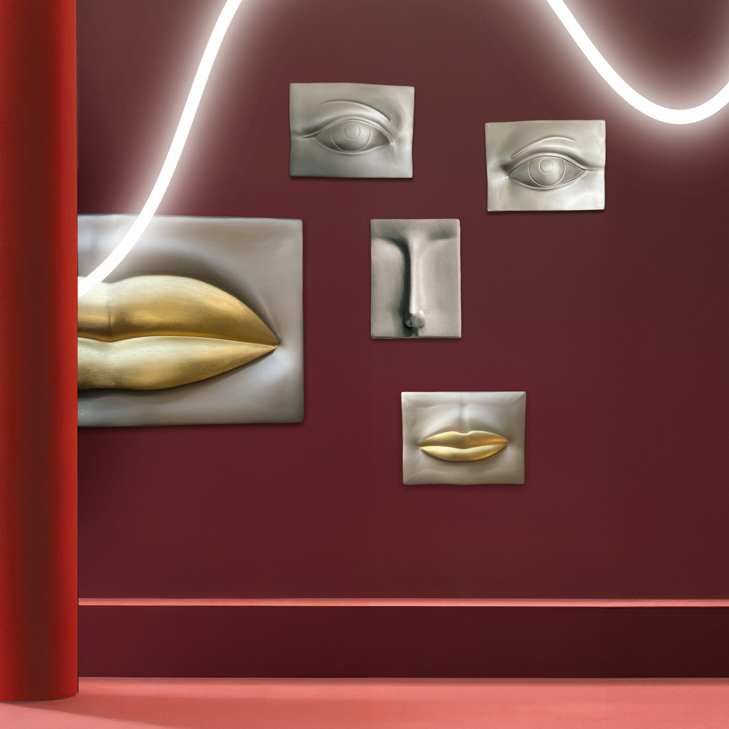 Collezione baciami: bocca bassorilievo in ceramica da muro con dettagli in foglia d’oro o argento applicata manualmente o in colore rosso, base in finitura champagne.