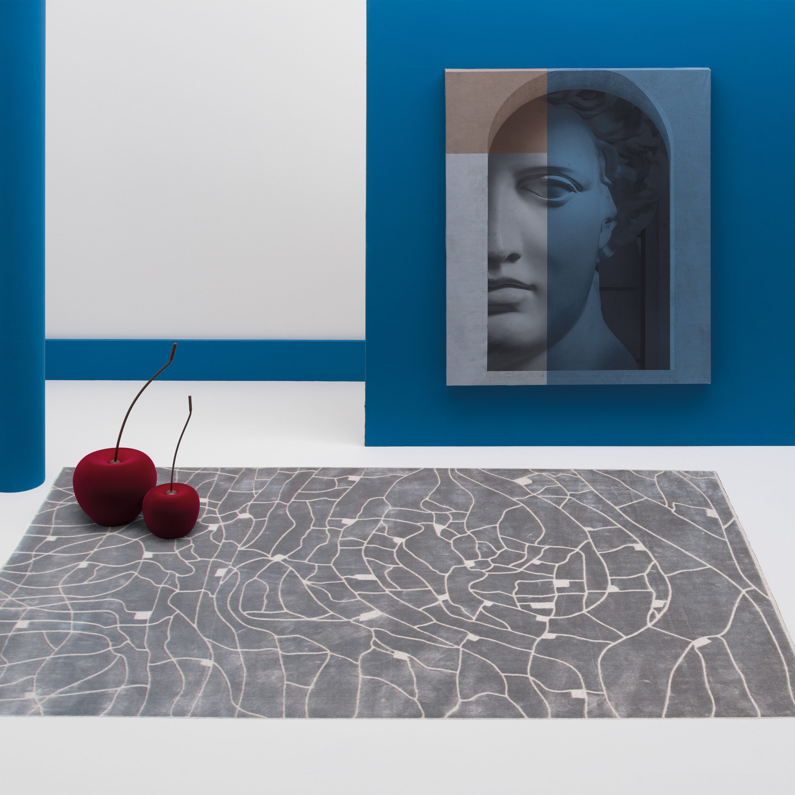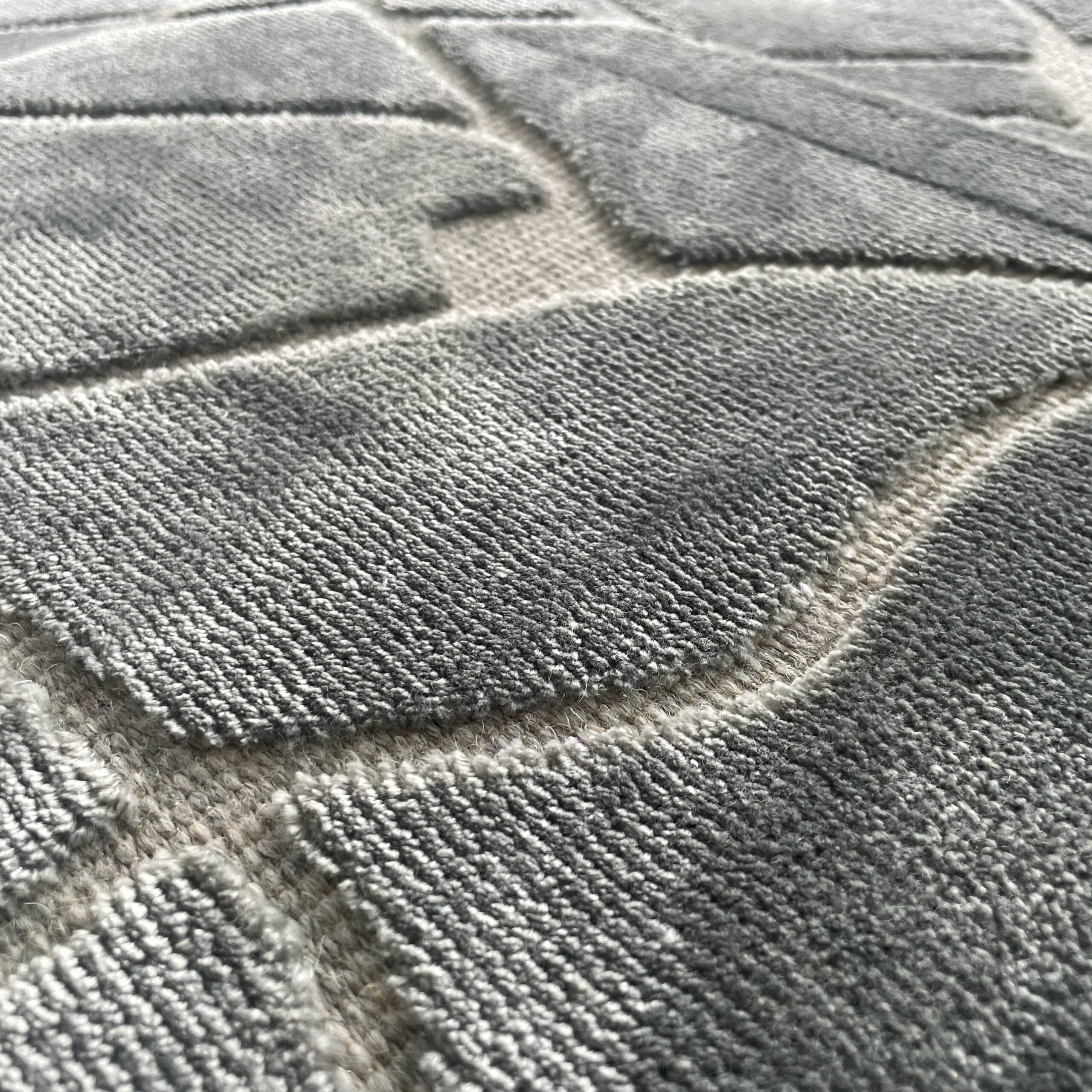 Tappeto base in lana rasata e disegno in viscosa a rilievo. Bordatura a filo in tinta.
