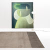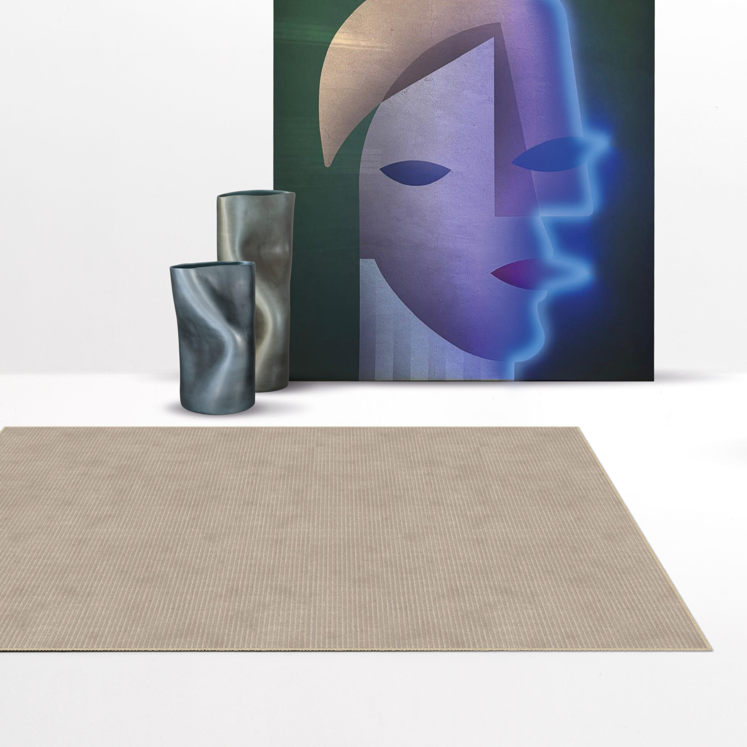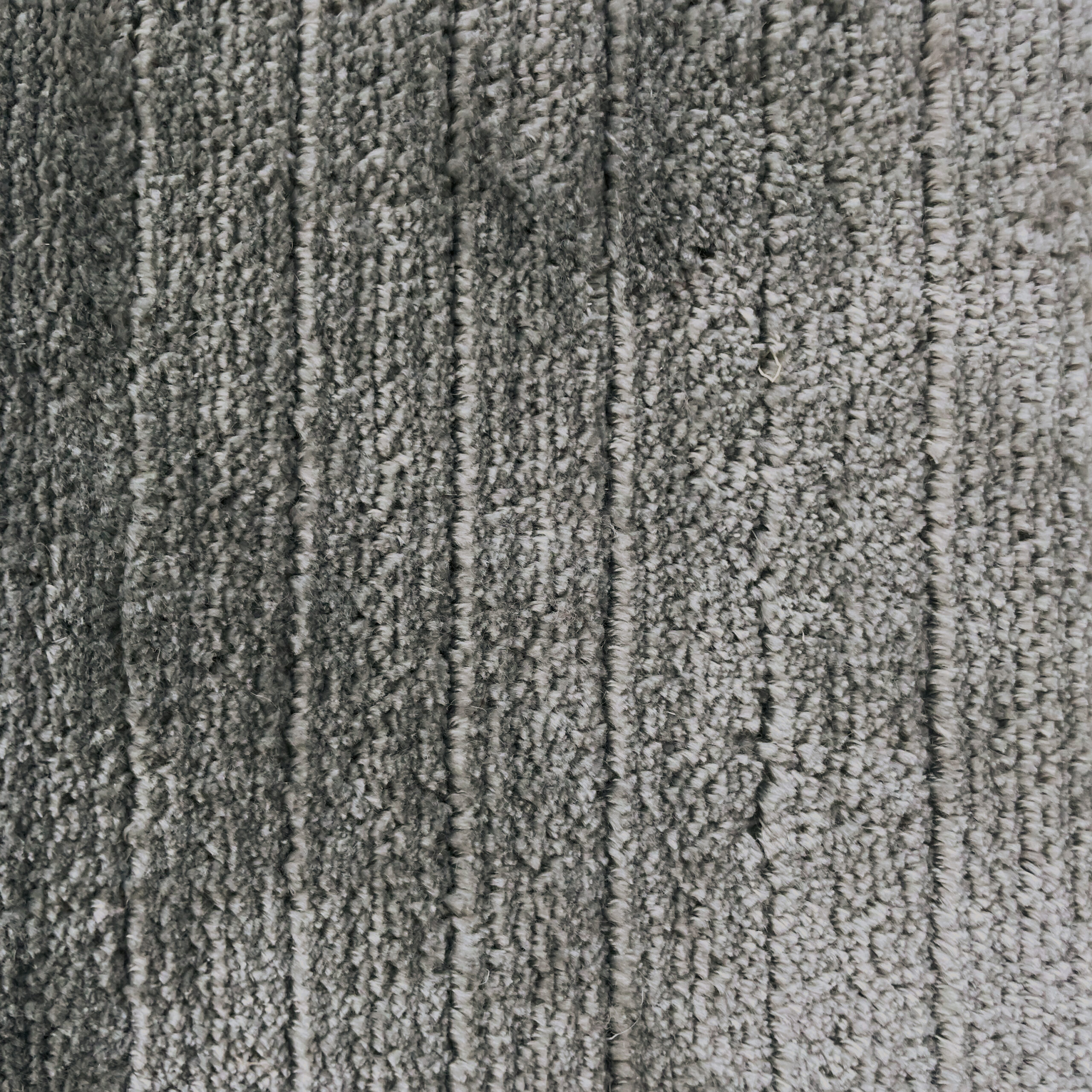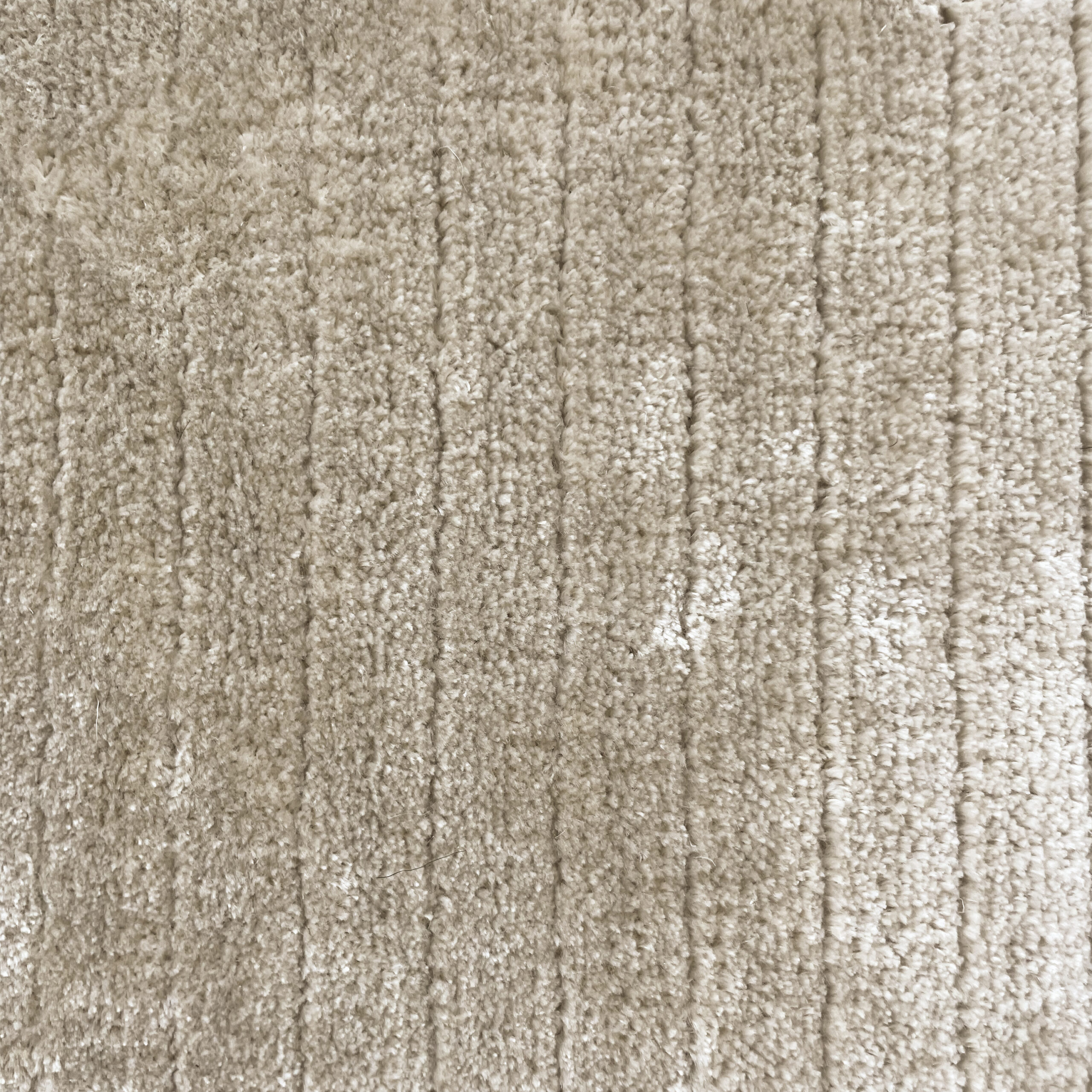 Tappeto base in lana rasata e righe in viscosa a rilievo. Bordatura a filo in tinta.